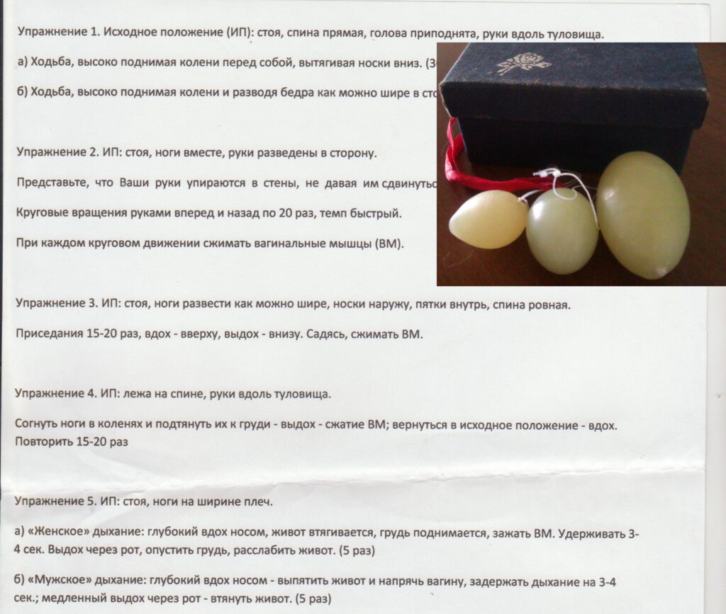 «Волшебные нефритовые яйца» представляли собой картонную коробочку синего цвета и три яйца разных размеров. Именно они должны были тренировать ВУМы, а также приносить любовь, благополучие и прочие чудеса в мою жизнь. И чудеса таки начались. Первым чудом стало опьяняющее чувство превосходства над другими девушками, потому что у меня был секрет — яйцо внутри. Вторым чудом стали непрекращающиеся знаки внимания даже от совсем не знакомых мужчин. И третьим чудом стали физические последствия ношения яиц — эрозия, воспалительные процессы, рецедивирующая молочница, таблетки, суппозитории… Как вы догадались — последнее чудо уничтожило приятные эмоции. Я уж не говорю о невозможности интимных отношений из-за постоянных курсов лечения.