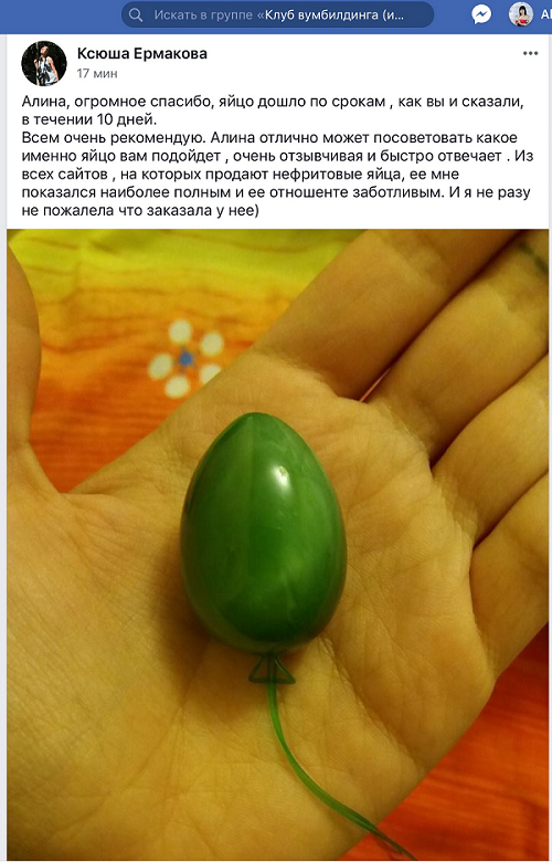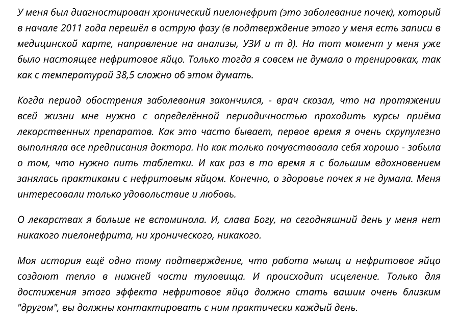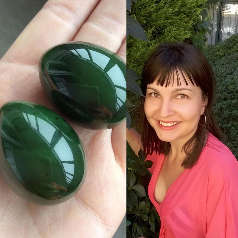 Одним из тренажёров были нефритовые яйца. Только они оказались подделкой. Из-за них у меня появилась рецидивирующая молочница, от которой не было спасения. К тому времени мой любимый мужчина стал моим мужем. И как человек с техническим образованием, он выяснил, что мои нефритовые яйца – подделка. В то время купить нефритовое яйцо было практически не возможно – поэтому он сделал для меня сюрприз. Он нашёл и купил настоящий природный нефрит и заказал для меня изготовление нефритового яйца в ювелирной мастерской.