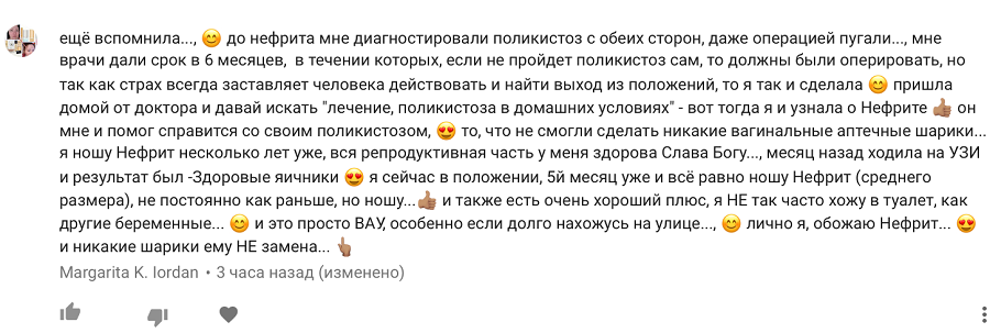 Когда я снимала самое первое видео про нефритовые яйца – очень сильно волновалась. И в результате в кадре я выглядела несколько напряжённой. Но он сказал, что пересмотрел все видео на Ютубе про нефритовые яйца и что моё — всё равно самое лучшее.