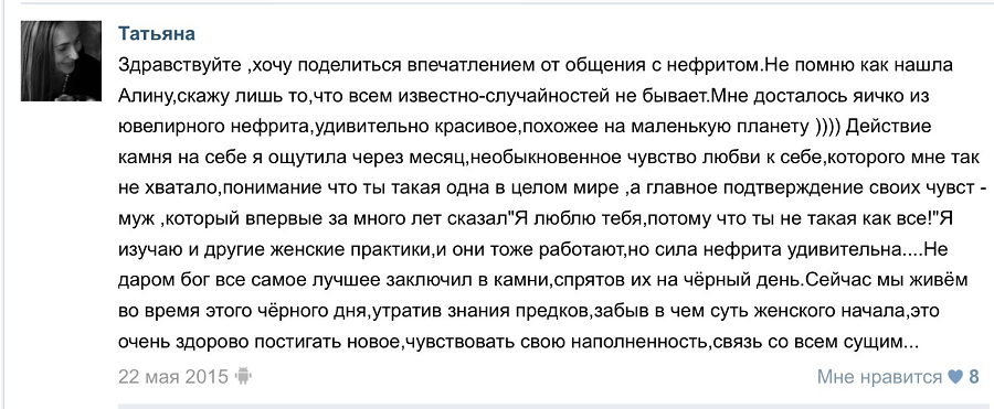 Я говорю это с полной ответственностью, потому что в моей коллекции есть все возможные сорта нефрита. Я испробовала действие каждого. Вначале у меня была неприязнь к медовому нефриту, потому что первый медовый нефрит, который попал мне в руки — был низкого сорта. Это значит, что в нём было большое количество примесей — он грубый и не давал нужного эффекта.