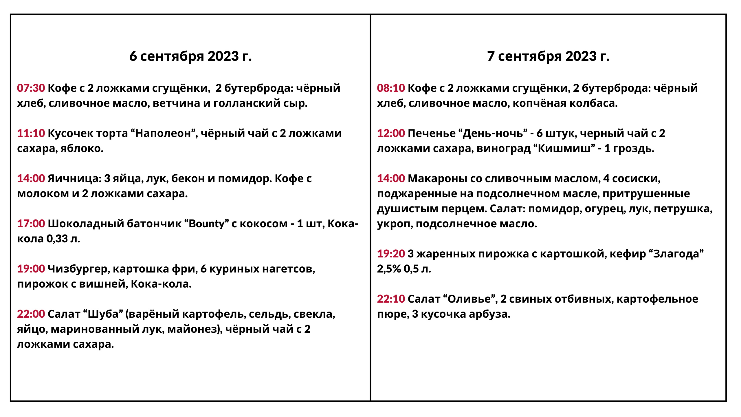 Третье. Пришлите Ваш рацион питания за двое суток.